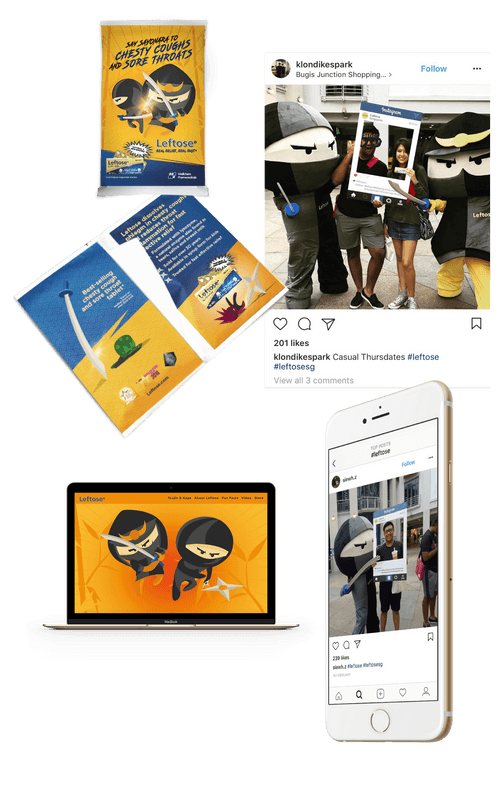 Leftose originally from Japan, is a medication for chesty coughs and sore throats. The challenge, was to highlight its dual properties of curing both a chesty cough and a sore throat. With the insight that Japanese products are highly effective and of good quality, the approach was to craft mascots to create top of mind recall and brand association for the medication. The mascots were named Toujin and Kage, a samurai and a ninja battling together as Leftose’s double heroes from Japan to bring 2 in 1 relief against chesty coughs and sore throats. Since the campaign rolled out through a product information website, bus ads and pharmacy POSMs, overall sales increased by 50% in 2015.